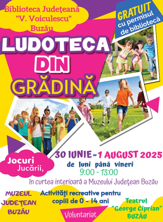 Biblioteca Judeţeană "V.Voiculescu" Buzău, alături de Muzeul Judeţean Buzău şi Teatrul George Ciprian Buzău, organizează o serie de activităţi în perioada 30 iunie - 1 august 2025.